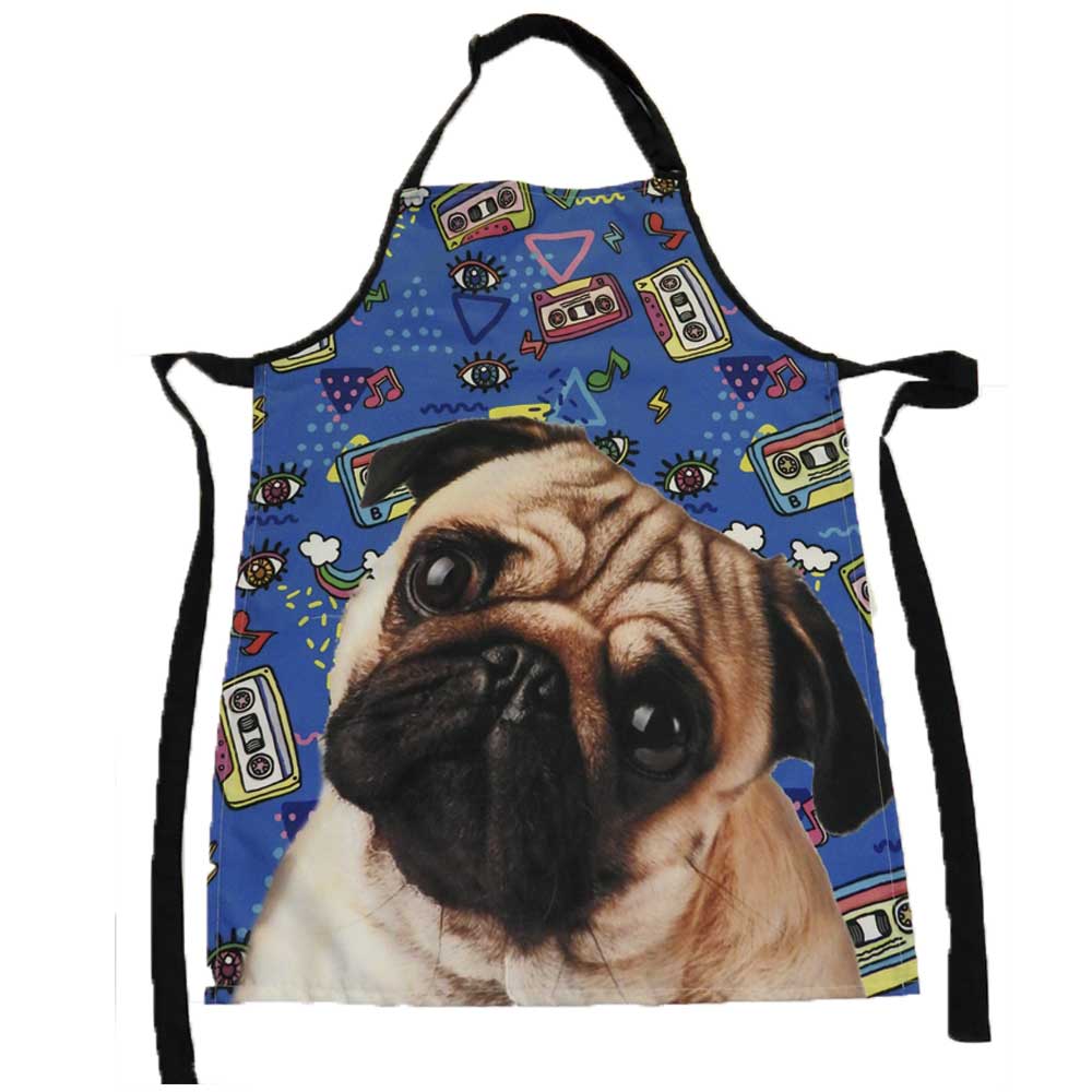 Delantal Pug, Elaborado en tela anti fluido, estampado en sublimación con tinta  de calidad que evita la perdida de color, perfecto para realizar cualquier labor, la tiranta del cuello trae trabilla la cual permite ajustar el delantal a la altura deseada, la medida del delantal es de 75 cmts de Largo por 55 cmtrs de Ancho, es talla única y un producto 100%  Colombiano.